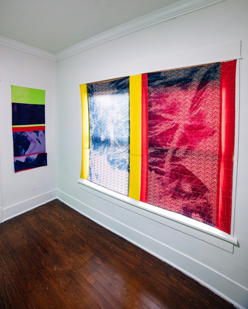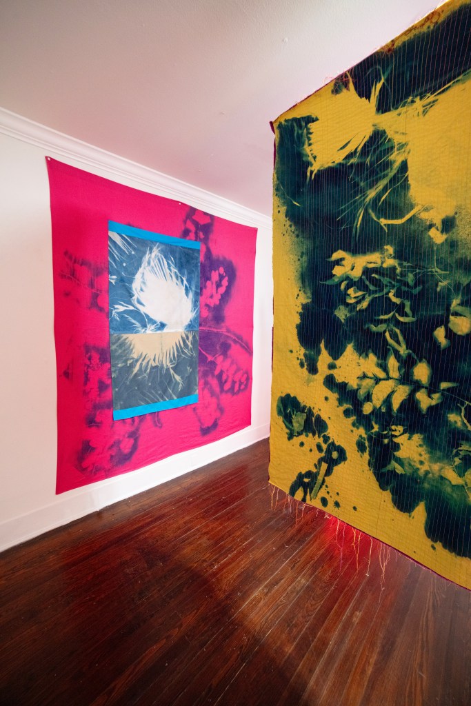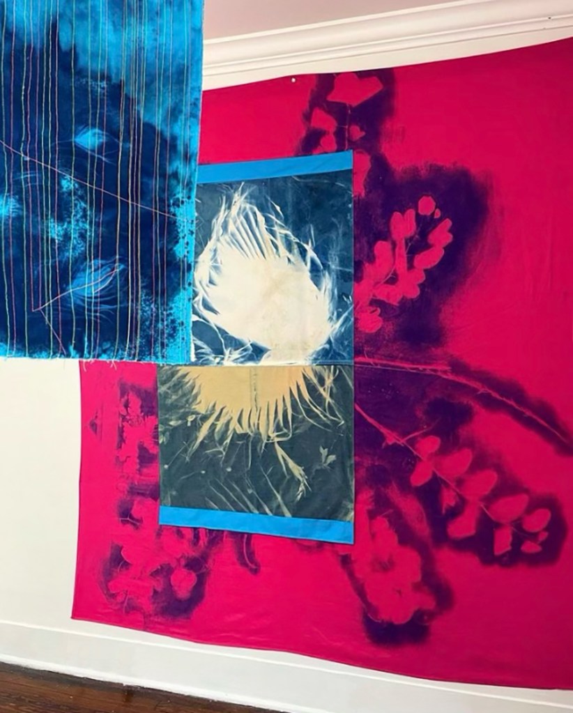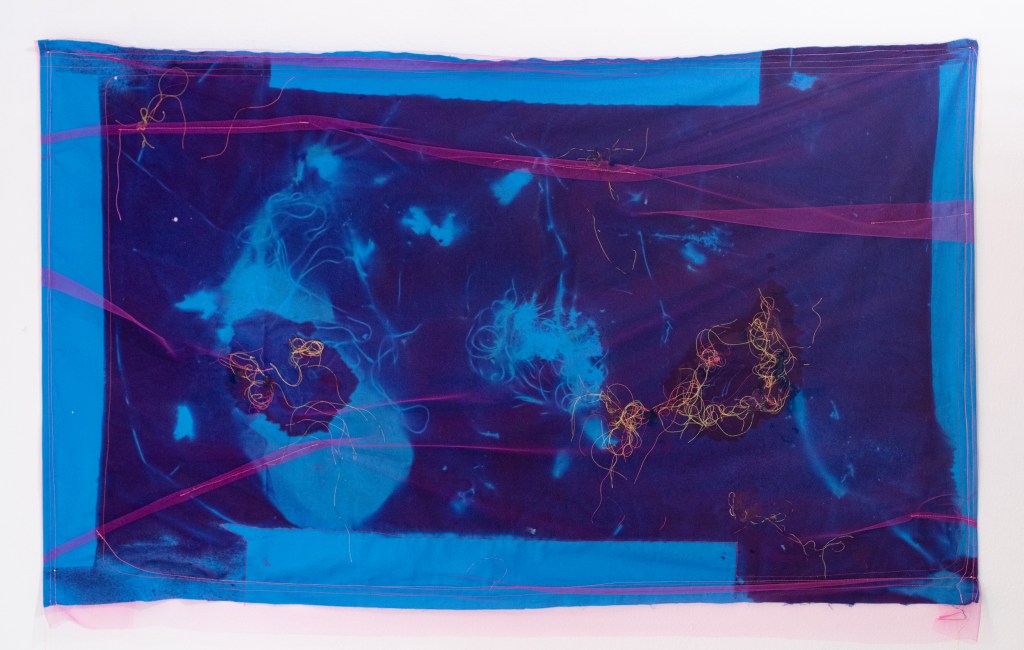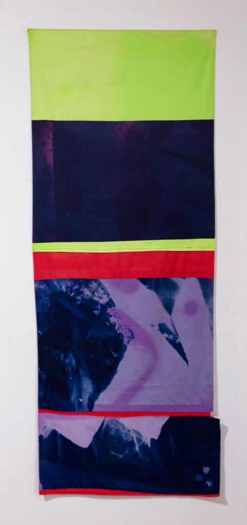 As the germination of plants requires sunlight, so do the foliating cyanotype splotches blossoming upon colorful bands of fabric. The textile seams demonstrate geometric confidence embrocated by the serous cyanotype blots. Observe this metamorphosis of photomontage, each exuberant mottle weds a photo process with painterly strategies, each leafy contour imbrued with intuitive ebullience. The bright stitches of Aguirre’s artworks display vibrant delineation across shreds of hue; the cyan upon red ripens into violet, sewn to imbued hems of ochre, olive, and orange.